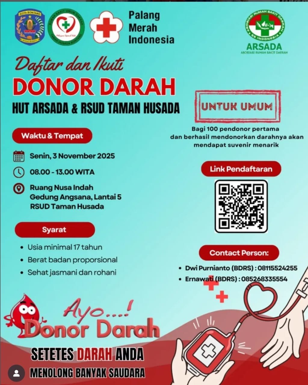 KARAKTER.CO.ID, BONTANG – Dalam rangka memperingati Hari Ulang Tahun (HUT) ke-23, RSUD Taman Husada Bontang kembali menunjukkan kepeduliannya terhadap sesama dengan menggelar kegiatan donor darah massal pada Senin (3/11/2025) besok. Aksi kemanusiaan tersebut akan berlangsung di Ruang Nusa Indah, Gedung Angsana lantai lima, dengan target sebanyak 100 pendonor.